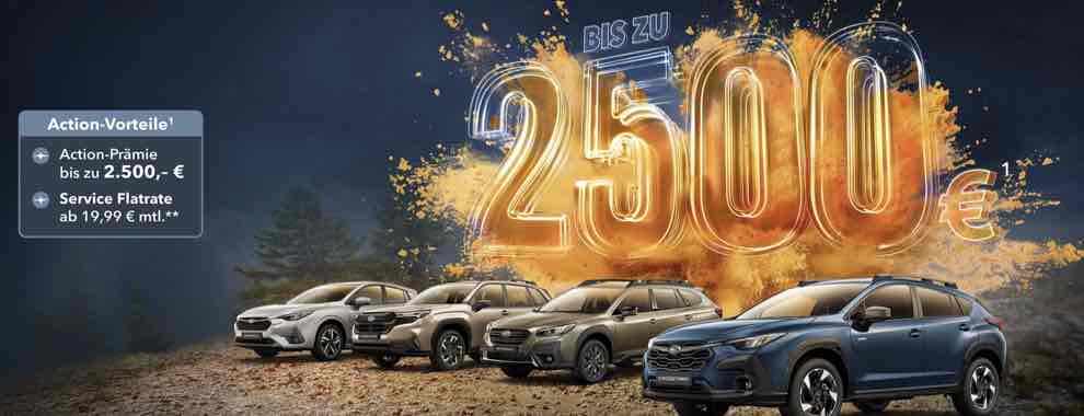 1 Die Aktion gilt vom 29.12.2025 bis 31.03.2026 in Verbindung mit dem Kauf eines aktuellen Subaru Impreza, Crosstrek, Outback oder Forester (Neu- oder Vorführwagen), Zulassung/Besitzumschreibung bis 30.06.2026 bei teilnehmenden Subaru Partnern. Die Aktion wird gemeinsam von der SUBARU Deutschland GmbH und den teilnehmenden Subaru-Partnern getragen und ist nicht mit anderen Aktionen der SUBARU Deutschland GmbH kombinierbar mit Ausnahme des Aktionsangebots zur Service-Flatrate. Sie sparen je nach Modell bei Kauf eines Subaru Crosstrek oder Impreza (MJ 2023/2024): 2.500,-€, eines Crosstrek oder Impreza (MJ 2025/2026): 1.200,-€, eines Outback (MJ 2024): 1.000,-€; eines Outback (MJ 2025): 2.000,-€, oder eines Forester (ab MJ 2025): 1.000,-€. Weitere Detailinformationen erhalten Sie bei Ihrem teilnehmenden Subaru Partner oder unter www.subaru.de.